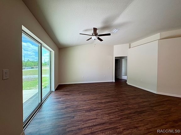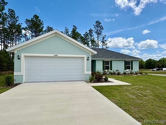 Located in The Pines in Citrus Springs, this 4-bedroom, 2-bath, 2-car garage newly built concrete block home is 1,728 Living sq. ft. built on a corner lot that is fully sodded and landscaped with an irrigation system. Kitchen comes with a large island and wood soft close cabinets. Granite countertops throughout the entire house. Luxury Vinyl plank floors in all the main living area with carpet only in the bedrooms. Owner's suite comes with a walk-in closet and tiled shower, double sinks and linen closet. The 2-car garage has a garage door opener and pull down-stairs to access the attic crawl space. 10-year structural Maverick warranty