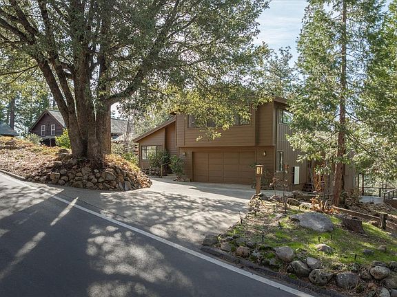 Rare opportunity to own one of the larger homes in Forest Meadows that not only offers up over 3000 square feet, it is ideally located on an oversized private .36 acre lot close to the Meadow park and pool amenities. Seller improvements are abundant, starting with a kitchen remodel in 2020, which includes quartz countertops, and stainless steel appliances. All decks have been replaced. Tesla back up battery included. Flooring updates include solid maple plank flooring and porcelain tile. Additional improvements include Vermont woodburning stove, Vermont propane stove, select windows, HVAC and mini split, exterior recently painted, paddle ceiling fans, deck awning, and more. Modern, Rustic, and Cabin Feel. Main level is a dream come true for large family gatherings and offers up flexibility for use boasting expansive family and living rooms, open kitchen, wet bar, two bedrooms, full bath. Downstairs offers up a larg recreation / game room and has also been used for a bunking bedroom. Upstairs is a private primary suite with large bedroom, attached full bath. Don't miss the huge attached workshop and golf cart garage in addition to attached two car side by side garage. Plenty of space and storage for all of your needs. Relax and entertain on decks with forest views. Easy level driveway. Enjoy community amenities: two parks, swimming pools, playground, tennis, pickleball, basketball, BBQ area, trails. Gated community with underground utilities. Located conveniently between downtown Murphys and Arnold. Recreation opportunities abound: Calaveras Big Trees State Park, high Alpine Lakes, Arnold Rim Trail, Bear Valley ski and cross country ski resorts. Winetasting, shops, dining throughout the area. 3 photos are virtually staged.