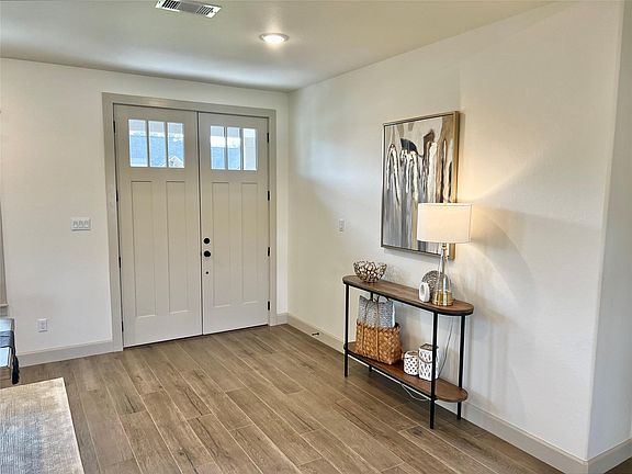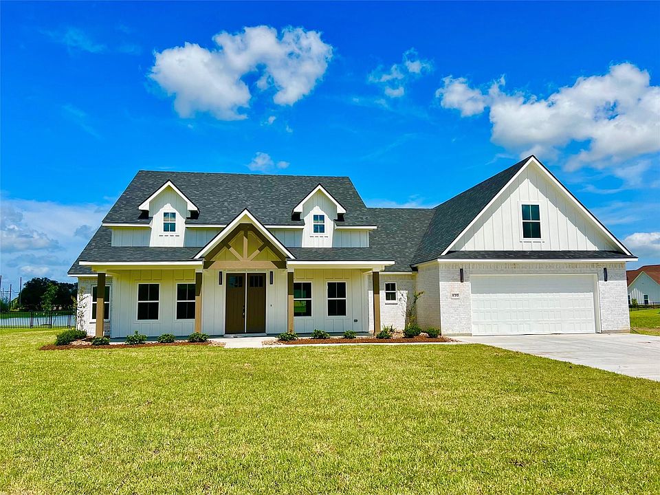 This modern farmhouse features white board and batten paired with modern white brick. Sherwin-Williams Smokehouse accents the columns, truss, garage, and front door, with a black shingle roof and white-trimmed windows. The kitchen overlooks the lake through three windows above the apron-front workstation sink, topped with sconces and set in a fully tiled wall. A 10-ft quartz island anchors the space, joined by a gas cooktop and wall oven/microwave combo. Side bar is perfect as a coffee or baking center. Cabinets reach the 9-ft ceiling. Focal point of this large open space will be a cast stone surround fireplace with built-ins on either side. Dual vanities feature signature hair/linen storage, and the large closet includes built-ins with laundry room access. Laundry room offers abundant cabinetry, counters, a workstation sink, a cleaning product closet, and a custom laundry basket sorter, with space for a second fridge. Large windows frame views of the oversized porch and lake beyond.