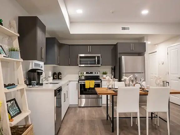 -Top floor unit-960 sq. ft-primary bedroom has ensuite-open concept with tons of natural light-4 stainless steel appliances: fridge, stove, dishwasher, microwave-in suite washer and dryer-central air-private balcony-LVP flooring throughout-secure entrance-pet friendly with fenced dog park on site