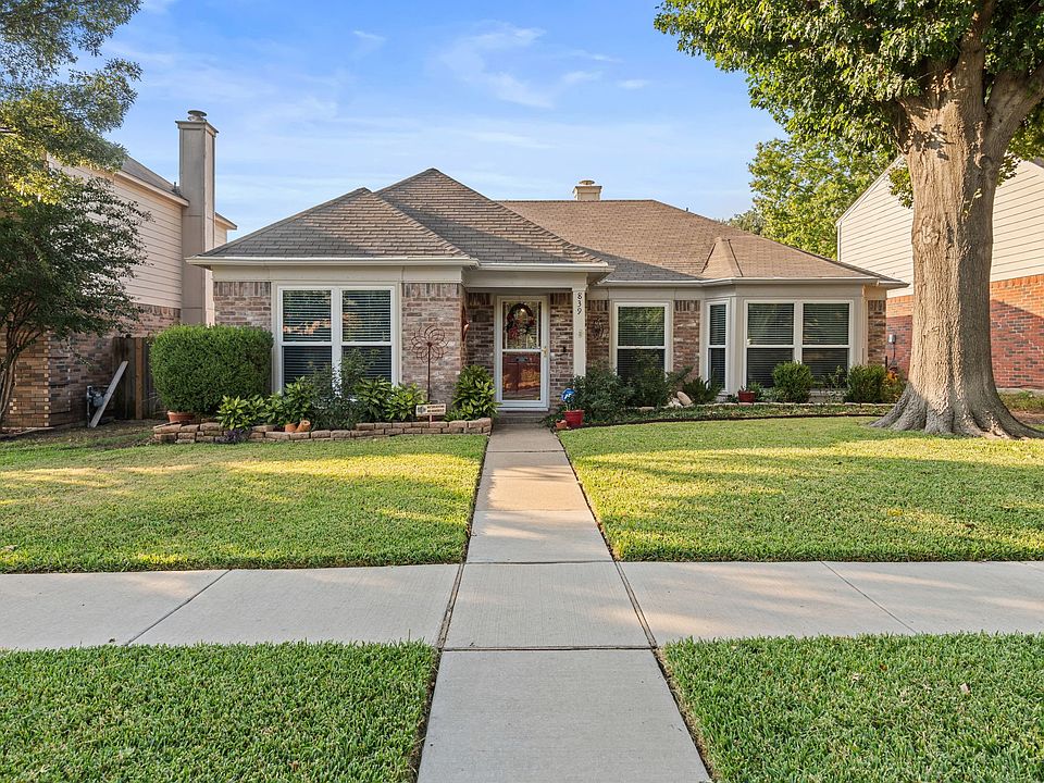 The spacious primary suite features bay windows that welcome in natural light, while the refreshed bathroom boasts dual sinks, a garden tub, and a separate shower. Recent updates include new windows in the front of the home and above the kitchen sink, professionally mounted exterior lights in the eaves of the entire perimeter, new recessed lighting in the kitchen and master bathroom, new ceiling fans, a new water heater, and two new storm doors.
