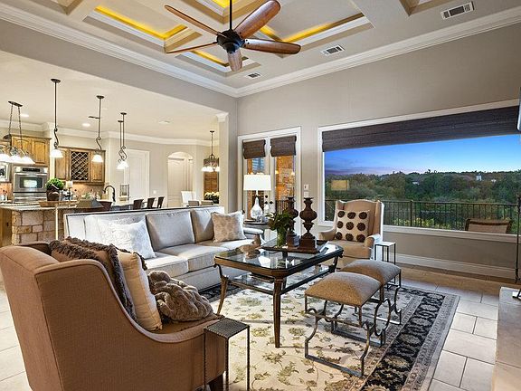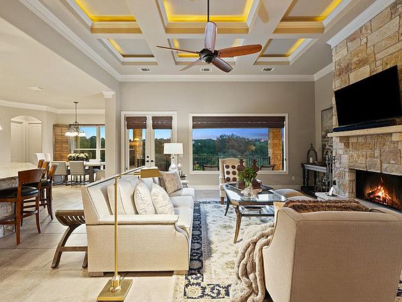Cozy fireplaceStriking stone fireplaceStylish interiorsBreathtaking lake travis viewsPanoramic lake vistasExpansive entertaining areaMotorized retractable awnings