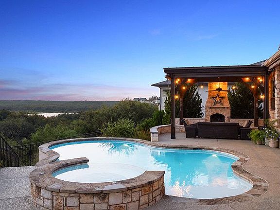 Welcome to 839 Wesley Ridge, an elegant residence with breathtaking Lake Travis views in the coveted gated Ridge Harbor community of Spicewood. Set on just over an acre, the home blends timeless sophistication with the relaxed beauty of the Hill Country, offering a balance of comfort and refinement. The backyard is designed for leisure and escape, highlighted by a sparkling private pool and spa that overlook sweeping lake and sunset vistas. Native xeriscape landscaping surrounds the property, while the oversized lot cascades down the hillside to create a rare sense of privacy and natural seclusion. Outdoor living is at its finest with a covered porch and an expansive entertaining area complete with a cozy fireplace, each enhanced by motorized retractable awnings for shaded dining, summer gatherings, or simply unwinding at the end of the day. Inside, a stone-arched foyer sets the tone for the home’s character, opening to a light-filled living area centered around a striking stone fireplace and flowing seamlessly into the kitchen and dining spaces. The chef’s kitchen, anchored by an expansive granite island, invites both casual meals and lively conversation. The private primary suite captures serene lake and hillside views and features a spa-like bath with dual granite vanities, a garden tub, and an oversized walk-in shower, while each secondary bedroom is thoughtfully appointed with its own ensuite bath for family or guests. Beyond the home, Ridge Harbor offers a lifestyle enriched by community amenities including pool, tennis and pickleball courts, waterfront parks, and a marina providing effortless lake access. Known for its welcoming atmosphere and active spirit, the neighborhood is a place to connect, relax, and enjoy the water. From the stylish interiors to the resort-style backyard and panoramic lake vistas, 839 Wesley Ridge embodies the essence of Texas lakeside living, thoughtfully maintained and beautifully enhanced, ready to welcome its next chapter.