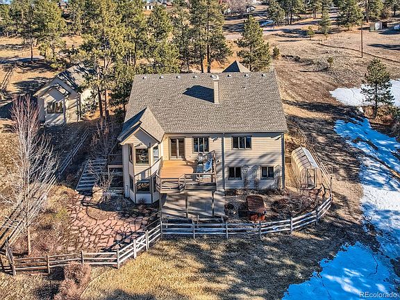 Nestled among towering Ponderosa pines and just minutes from town, this stunning ranch home offers the perfect blend of convenience and tranquility. Enjoy breathtaking views of Pikes Peak and spectacular sunsets from your expansive deck, perfect for entertaining or simply soaking in the beauty of the Colorado landscape. Below a spacious covered patio. Inside, the home is filled with natural light and designed for both comfort and style. The heart of the home is the expansive kitchen, featuring abundant cabinetry, sleek stainless steel appliances, and a large island that seamlessly connects to the family room creating an inviting space for gatherings. The great room is a true showstopper, boasting soaring vaulted ceilings, a wall of windows that flood the space with natural light, and a beautiful fireplace that serves as a warm and inviting centerpiece. The large primary suite is a private retreat, featuring a spa-like bathroom with luxurious finishes. The finished basement offers even more space with a family room, work out room, multiple bedrooms, providing plenty of room for family and guests. Step outside and experience the true magic of this property an oasis of natural beauty and thoughtfully designed landscaping. A modern greenhouse and an incredible garden provide the perfect space for growing fresh vegetables, herbs, and perennials. Mature trees and lush plants are carefully placed throughout the property, creating a serene, park-like setting. Meticulously maintained and beautifully finished, this home is a true sanctuary, where the whispering pines, stunning scenery, and vibrant gardens offer a peaceful escape. Detached garage 24x37 with 12.5x18 door. Tractor included, salt water hot tub, hot water heating system, water softener, pool table. Newly painted interior, wood floors refinished, new carpet on main floor. Manual transfer panel for portable generator. Minutes from downtown Parker and 15 minutes to I-25. Near by E-470 makes airport access a breeze.