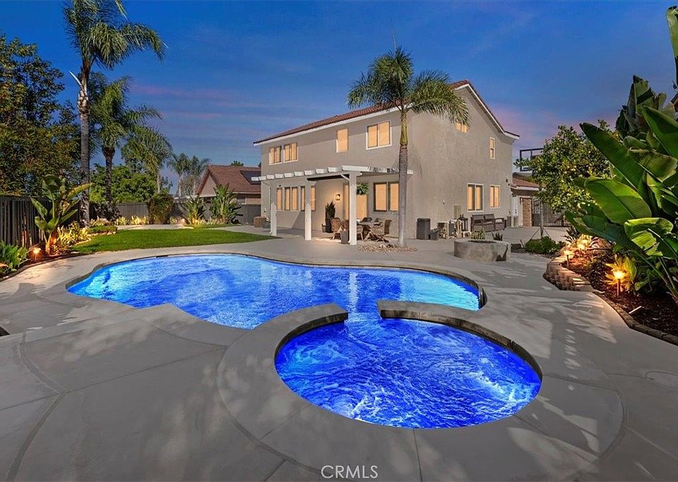 Enjoy entertaining in the backyard with an Alumawood patio cover, a recently resurfaced pool and spa, and a relaxing fire pit area. Even all the pool equipment has been replaced!