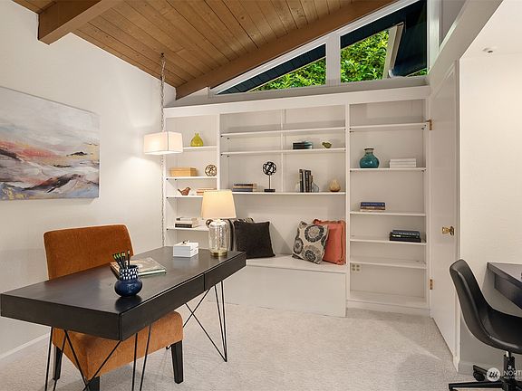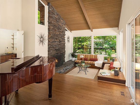 NEW PRICE! Inspired by MCM architecture, this airy floor plan with its soaring ceilings & walls of windows surround a central deck/patio allowing for seamless indoor/outdoor living. Main floor offers an upgraded kitchen with new appliances that opens to the family room; a dining room & living room that overlook the deck & serene backyard; and a den/office (4th BR) plus 2 half baths. Downstairs, you'll find the large primary suite w/a sitting area, gas fireplace, 2 closets, and new ensuite bathroom with steam shower. Two additional bedrooms and a flex room round out the lower floor. Central AC, 2 car garage, Mercer Island schools, close to island amenities and centrally located to both the Seattle/Eastside. Seller Inspection Report.