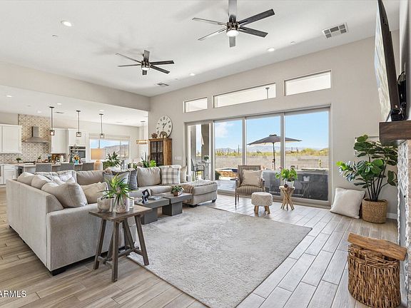 The open-concept floor plan centers around an extraordinary chef's kitchen, curated with granite countertops, a designer backsplash, and premium stainless steel appliances. Custom features include a gas cooktop, 42'' solid wood upper cabinets with soft-close drawers, double ovens, a built-in refrigerator, an oversized island ideal for entertaining, and a generously sized walk-in pantry. Every detail has been elevated, from the striking stone fireplace to the wood-look tile flooring that flows seamlessly throughout the living areas. The split floor plan ensures privacy, with each bedroom offering its own en-suite bathperfect for hosting guests in style. The primary suite is a luxurious sanctuary, featuring a massive glass-enclosed tiled shower, deep soaking tub, dual vanities, and an expansive walk-in closet. Additional custom touches include a versatile flex room, an optional fourth bedroom or executive office/den, remote-controlled blinds, a private interior courtyard, a putting green, and a spacious three-car garage.