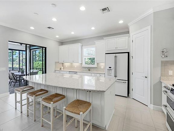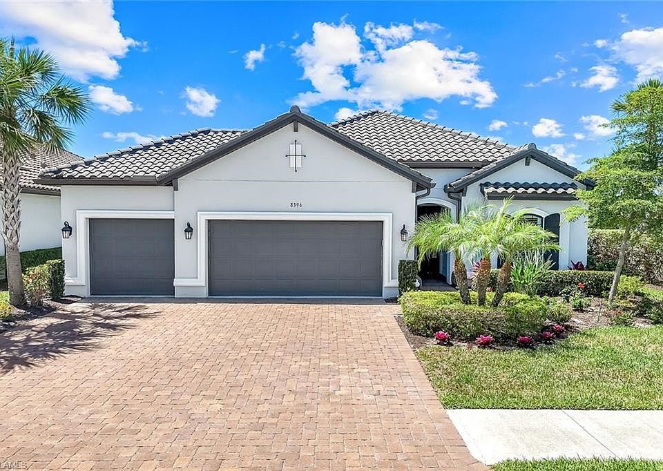 Southern exposure with a fabulous everlasting view of water and wooded preserve! A peaceful, serene, private corner lot houses this immaculate, well maintained 3 Bedroom, 3 Bath plus Den with a rare 3 CAR GARAGE home in lovely Hacienda Lakes. All the best finishes were selected with large scale light tile, fresh white crown moulding, tray ceilings in foyer and living area, sparkling quartz counters, all white cabinetry, plus the added security of electric storm screens on the covered lanai. Spacious primary suite with walk in closet, dual sinks, and the luxury of a soaking tub plus large shower and wonderful bay window. 2 large guest rooms situated away from the primary suite provides the privacy and relaxation your friends and family will enjoy. Entertaining is a dream in this delight, where the heart of the home is equipped with stunning all white matte finish GE Cafe series appliances and oversized island with generous seating and storage. The outdoor screened lanai is the perfect retreat for this special home, overlooking the sparkling blue water of your private pool. Hacienda Lakes offers amenities galore with a fabulous community center featuring a resort style pool plus a resistance lap pool, tennis, pickle ball, and bocce courts, fitness center, fire pit, library, spa, dog park and play area. Located near a hospital, Publix shopping center, and restaurants galore, only minutes from Marco Island and downtown Naples, this special home has everything you could want and more! Grab your own slice of paradise and make this beauty your own!
