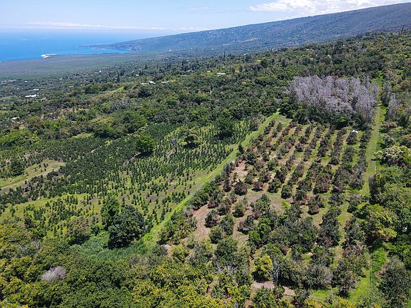 11.84 acres located up a sweet country road in Honaunau, South Kona, known as Telephone Exchange Rd; just a wee jiggity-jog off of the Hawaii Belt Rd, up a single lane leads you to this private orchard of 400 Macadamia Nut trees. The perimeter fenced property is divided by the access road. There is approximately one acre of forest on either side of the road, left wild as a sanctuary of native flora and fauna. Go through the wooded area to 3 acres of Macadamia Nut trees in the front and 7 acres in the back. Fully mature, grafted Macadamias were planted nearly 40 years ago.