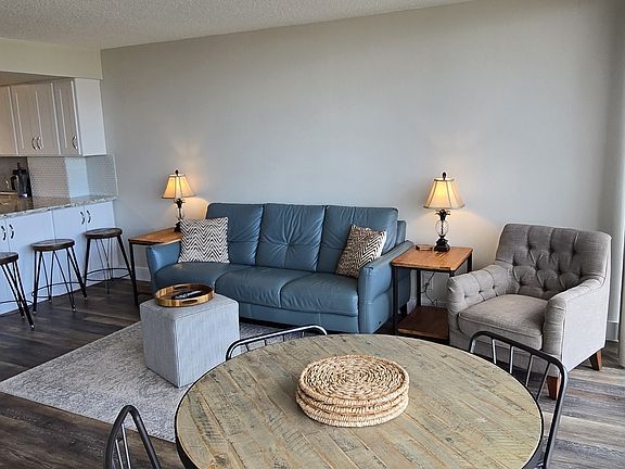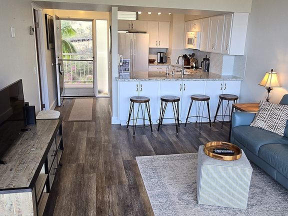 This exceptional unit is fully furnished and ready for immediate move-in, providing a seamless transition into island living. The interior has been thoughtfully designed and beautifully remodeled, reflecting a high standard of contemporary appeal. A custom-built Murphy bed is a standout feature, ingeniously maximizing space and functionality within the 680 square feet of total floor area. This allows the space to effortlessly transform from a comfortable bedroom to an expansive living area, adapting to daily needs.