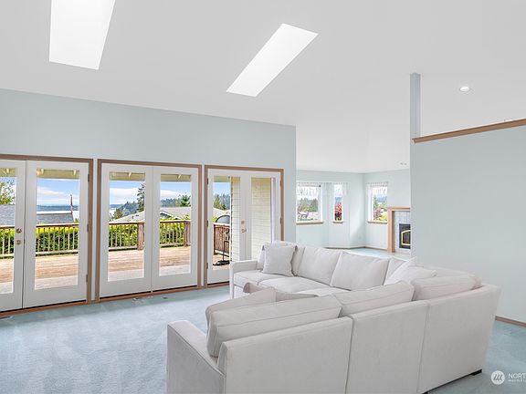 Let the sunshine in! This spacious, light-filled view home is ready for your personal touches with a large living room and a cozy great room, with an Extraordinaire fireplace off the tiled kitchen. The large deck, which overlooks the Shipping Lanes and Cascade mountain range, is partially covered for year-round use. The primary suite, a guest bedroom and bathroom, and an office with closet, complete the main level. The lower level, which is open and spacious for multiple uses, offers walk-out access to a patio and the back yard. The lower level also features a three-quarter bathroom. Wonderful outdoor privacy in the back yard with a charming pond. Side yard features raised beds and a small fruit orchard. Membership in the Beach Club.