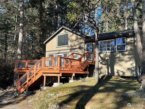 Welcome to 84 Albert Street, an absolutely charming 2 bed, 2 bath view cottage nestled in the serene community of Doe Bay. An excellent vacation rental history + income, the cottage is a peaceful retreat and fantastic investment opportunity. Great reviews on Airbnb. This delightful home offers a sun-drenched deck perfect for relaxation and soaking in the southerly water views. Step inside to discover an open floor plan that boasts high ceilings and large windows, allowing natural light to flood the 998 square feet of living space. The main level features a cozy living area and a well-equipped kitchen. Each level of this sweet home hosts a beautiful bedroom. Being sold furnished, this home invites you to experience unique island living.