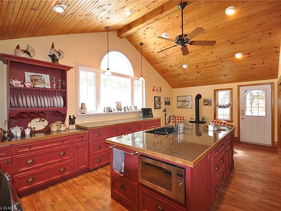 Absolutely Stunning Year Round Waterfront Home on Beautiful Four Mile Lake. Western Exposure to enjoy Stunning Sunsets, Exceptionally clean weed-free waterfront, safe shallow water gently sloping to a drop off at end of Dock. Private Lot Surrounded By Trees. Gorgeous Bright Kitchen with wow factor, S/S Appliances and Catherdral Ceiling. Cozy Sunken Family room with Vaulted Ceiling, Fireplace overlooking Lake and Walk out to Deck. Work from home with high speed internet. 2 Bedrooms on Main floor and 3rd Bdrm in Loft with Bathroom. Cabin with 2 pc Bath and Outdoor shower. Peaceful 3 season screened room overlooking lake. Complete with Boathouse, Dock and Marine Railway. Included is One Share Of 54 Acre Parcel Across Road Owned By The Cottage Association.