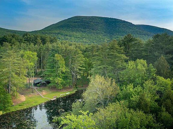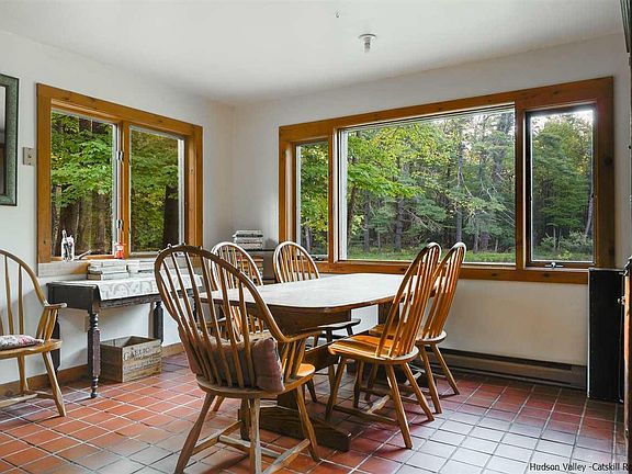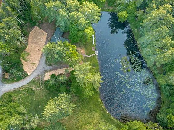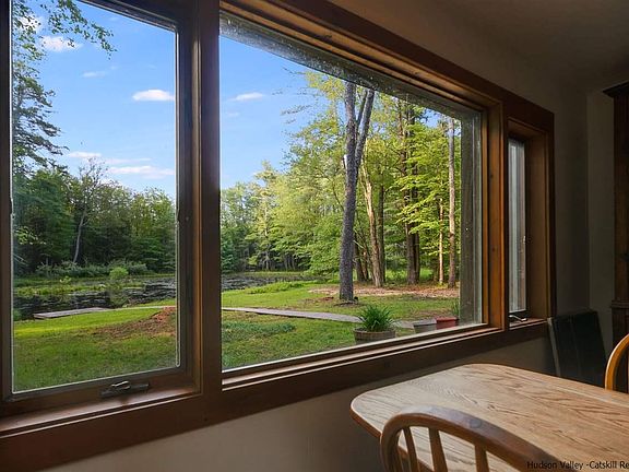 Your own Woodstock oasis awaits situated on 4 private acres amongst mature trees and overlooking its own majestic, spring fed pond. Geese swimming, turtles sunning on the island and historically stocked with trout for great fishing this pond is large enough to swim and canoe. It is the centerpiece of this beautiful landscape. The 3 Bd/ 1 Ba ranch has been enjoyed and loved by one family for over 40 years. Walk into the exposed beamed space bathed in light with walls of windows and skylights. Enjoy winter nights by the woodstove insert surrounded by the original, stone fireplace. Gaze out at the beautiful pond from large picture windows in the kitchen and dining area. The gracious, exposed beamed primary bedroom with walls of windows overlooks pond as well. Every room designed with the natural outdoor landscape in mind. Natural wood throughout and so much original detail gives this home a warm yet open feel. One floor living with so much possibility to bring your own vision. Bordering the state lands of Wilson State Park your views will never be obstructed by neighbors. Have morning coffee at your kitchen table looking out at the peaceful landscape. Lounge on the dock surrounded by nature and tranquility. Truly a rare, special property offered for the first time.