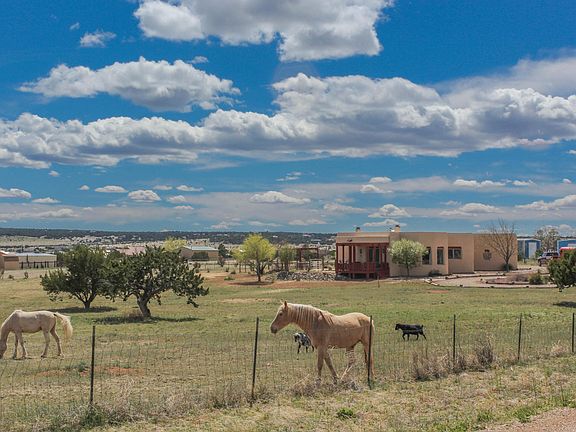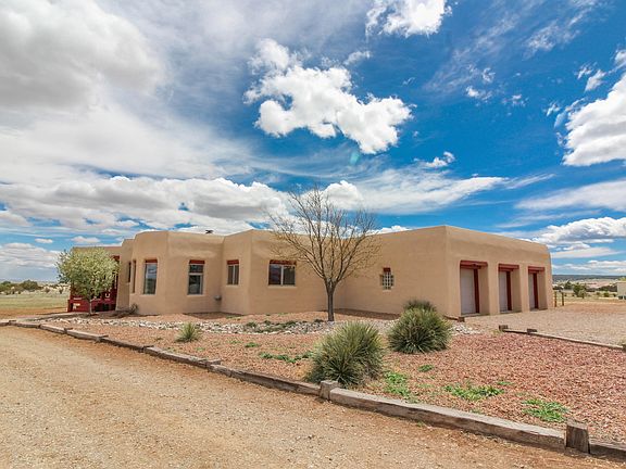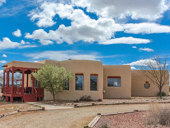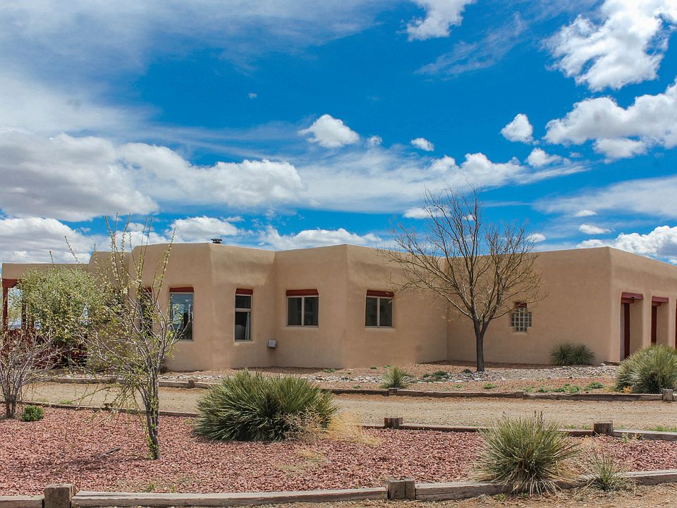 This custom built home sitting at the foot of South Mountain is a true work of art! Polished plaster walls accent the locally curated posts, corbels and beams. Incredible chef's kitchen with ample cabinet and countertop space, oversized fridge and freezer, large island complete with a prep sink, copper sink in the wet bar, ice maker, undercabinet lighting...this kitchen has it all! Both bedrooms are spacious and boast built in kiva fireplaces. The covered deck out front offers incredible views of South Mountain, while the pergola covered patio out back allows a place to relax and enjoy the breathtaking sunsets over the Sandias. The 4+ acre property is fully fenced and ready for your equine family members as well!