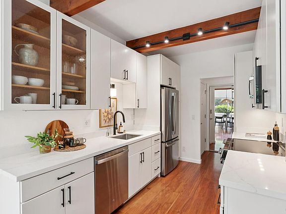 This beautifully updated gem offers sunny, single-level living near downtown San Anselmo. Combining architectural character, including high ceilings, exposed beams and a thoughtful floor plan, this unit also has all the modern conveniences to be a peaceful retreat where you can unwind and leave the busy world behind. You will find a bright, open kitchen - truly the heart of the home. With solid wood cabinets, quartz countertops, and brand-new appliances, it is a space that's practical with a designer style. The kitchen flows naturally into a cheerful dining area and a spacious living room, perfect for everyday life or hosting friends and family. Sliding doors open to a private patio, creating an easy indoor-outdoor flow where you can enjoy your morning coffee or dinner under the stars. The two comfortable bedrooms are thoughtfully designed to offer plenty of space and relaxation, each with large closets fitted with custom Elfa organizers. Residents have access to a newly resurfaced pool, great for a refreshing swim or soaking up some California sunshine. Located in a prime spot, this wonderful home is just a block from lively downtown San Anselmo, filled with charming stores, multiple coffee shops, and award-winning restaurants waiting to be explored.
