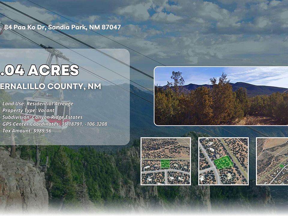 Discover 1.04 acres of possibility at 84 Paa-Ko Drive in Sandia Park. Nestled in the prestigious Paa-Ko Communities, this homesite offers the perfect balance of natural beauty and convenience. Mature trees, rolling terrain, and sweeping mountain views create a serene setting for your dream home. Enjoy access to the acclaimed Paa-Ko Ridge Golf Course, neighborhood amenities, and the cool mountain climate just minutes from Albuquerque and Santa Fe. Whether as a primary residence or a getaway retreat, this spacious lot provides the backdrop for true New Mexico living.