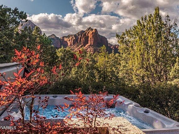 Step into Sedona luxury in this spectacular, secluded, 4-bedroom, 4-bathroom home nestled on a nearly 1-acre hill, with a 270-degree view of Soldiers Pass and phenomenal unobstructed red-rock panoramas from virtually every angle. This sophisticated home takes full advantage of the rugged Sedona landscapes, with an open concept layout, cathedral ceilings, and soaring windows that maximize the unobstructed mountain views.The sleek and striking great room offers a stunning steel and wood curved staircase, a massive gas fireplace, original artwork from well-known local artists, huge flat-screen TV's, butter-leather furniture, and a travertine and Italian-leather dining set, all of which add to its glamor and appeal. Entertaining is easy in the completely remodeled gourmet chef's kitchen with granite waterfall countertops, a large center island, countertop seating, a coffee bar, KitchenAid gas oven and microwave, 5-burner Monogram gas cooktop, dual-zone wine refrigerator, copper sink with touch-operated faucet, RO water system, and every cooking gadget that a great cook could ever want! Every chef's dream!