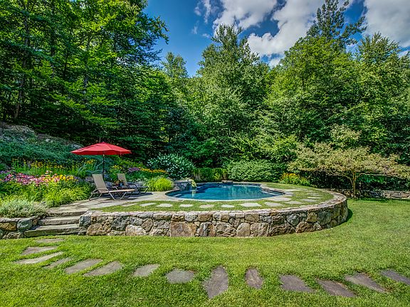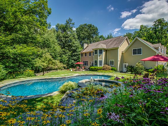 Stunning Colonial & sparkling pool with spa nestled into gorgeous property abutting Ward Pound Ridge Reservation's 4,315 quiet, picturesque acres. Formal living and dining rooms. Expansive gourmet kitchen with cherry cabinets & breakfast nook opens to large family room with cathedral ceiling and floor to ceiling stone fireplace. Master Bedroom Suite with Spa Bath. 3 additional generously-sized family bedrooms. Separate stairway leads to light and bright large bonus room. Finished lower level features dual office areas. Perennial Gardens and lush yard. 3-Car Garage.
