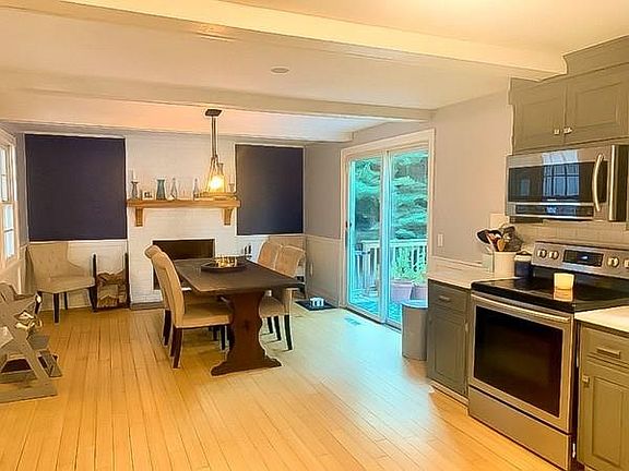 Move right into this 4 bed, 2 bath cape on just under an acre of land featuring remodeled kitchen, baths & fenced in back yard. Plenty of off street parking with large circular easy access driveway. This home boasts public water, new gas heat & central AC (2017), roof (2006) security system, septic system/leach field (2019), nest thermostats, stainless steel appliances, gorgeous quartz counters, subway tile back splash, bamboo hardwood floors & cozy wood burning fireplace in the open concept dining/kitchen area. New wood deck, plus a fenced in back yard w/ special natural fencing, allows the backyard to keep it's natural feel yet still be enclosed. Conveniently located across the street from town conservation land soon w/ walking trails perfect for nature enthusiasts. And just a short drive to local stores, restaurants, surrounding towns and schools. Freshly painted light exterior to match the inside which is full of light, tasteful updates & classic modern flare!