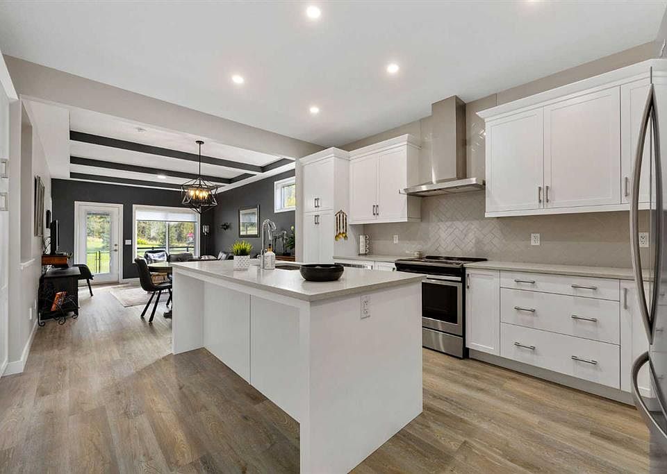 Mature treesBow river pathwayGemstone lightingElectric retractable awningOpen-concept main floorWhite shaker cabinetryQuartz countertops
