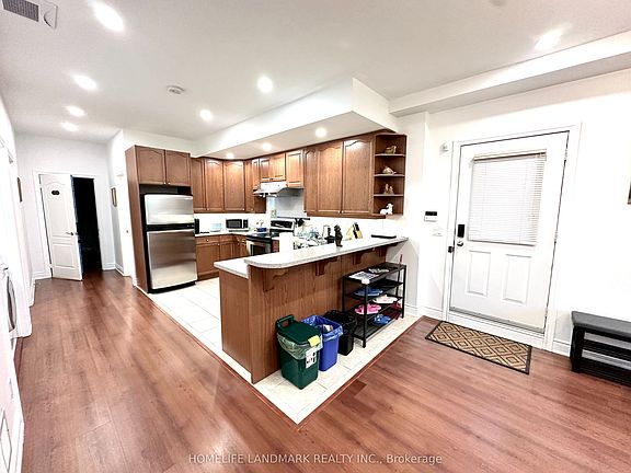 Welcome to this bright and spacious 2-bedroom walk-out basement apartment located in the highly sought-after Thornhill Woods neighborhood. This move-in-ready home offers a carpet-free open-concept layout, enhanced with modern pot lights, flat 9-foot ceilings, and a private in-unit laundry for your convenience. The contemporary kitchen features brand-new appliances, an under-mount sink, and sleek cabinetry, perfectly blending style and functionality. The professionally finished interior includes two generously sized bedrooms, making it an ideal space for professionals, students, or small families. Enjoy a shared backyard overlooking a serene forest, with utilities shared. A rare opportunity to live in one of the most desirable communities! Existing furniture and 1 driveway parking are free and optional for tenants' choice .