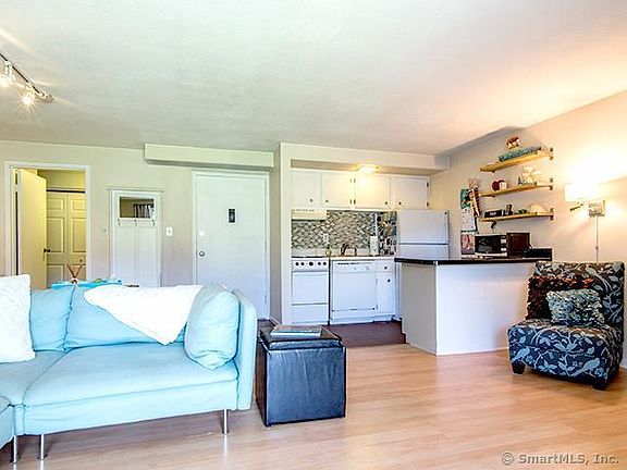 Ground-level condominium offering an open studio layout with hardwood flooring and an updated bathroom. The large sliding glass door opens to a private patio, bringing in natural light and extending the living space outdoors. A generous double closet area provides flexibility and can be used as a bedroom space or home office. Residents of Wilton Crest enjoy a variety of amenities, including a swimming pool, tennis courts, and landscaped grounds that create a pleasant community setting. The property is located within walking distance to Wilton Center, offering access to shops, dining, as well as the nearby train station for an easy commute. Additional conveniences include a common laundry facility located directly across from the unit and a private storage bin for extra space. This condominium combines comfort, convenience, and community amenities in a desirable location.
