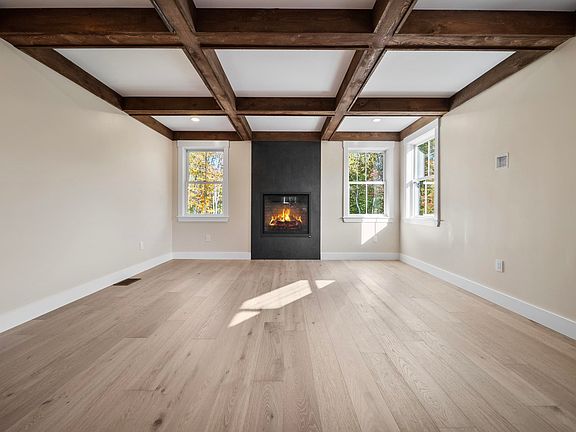 A modern take on timeless New England architecture, set on a picturesque and fully landscaped wooded lot in the desirable town of Gilford, NH - offering a perfect blend of privacy, scenic rolling hills, and a flat usable yard in a prime commuter location. This 100% completed new construction home showcases exceptional craftsmanship and designer finishes throughout. The open layout features 5 bedrooms, 4.5 bathrooms, and a sun filled finished walkout lower level with daylight windows and a ¾ bath—ideal for guests or additional living space. A front entry leads to a grand open concept great room with coffered ceiling and custom gas fireplace. The gourmet kitchen impresses with Café appliances, custom cabinetry, and a large island, flowing seamlessly to the dining area. A first-floor office with custom built-ins and steel glass French doors offers the a sophisticated workspace. Upstairs, the primary suite features a wood-clad ceiling, and a spa-inspired bathroom with tiled shower, double vanity, and soaking tub. A second suite includes a private en suite bath and generous storage. Additional highlights include gorgeous hardwood flooring throughout, a heated garage with epoxy floors, a stylish mudroom off of the garage, second-floor laundry, and polished concrete floors in the finished lower level. Glass shower doors for showers will be completed soon! One year builder warranty!