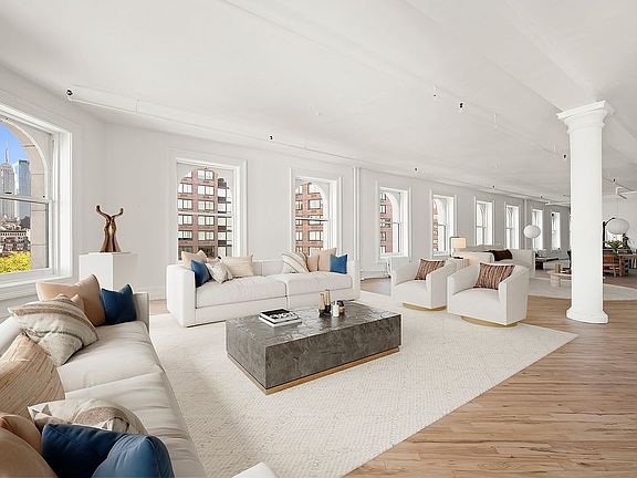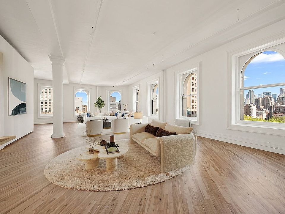 Soaring ten floors above Broadway, this 3,000 square-foot home makes a remarkable first impression with sky-high ceilings supported by bold columns, original hardwood floors, and 14 enormous arched windows framing wonderful natural light and iconic outlooks. Key-lock elevator entry delivers you directly to a sprawling open living space, perfect for relaxing and entertaining alongside unimpeded views of cotton-candy sunsets, Union Square and the Empire State Building. An adjacent windowed nook with exposed brick is the perfect setting for your gourmet dream kitchen. Meanwhile, the building's wedge shape creates an ideal layout for a private wing with primary and secondary bedrooms and baths, while the western exposure can easily accommodate an additional bedroom suite, a media lounge, or a home office. The only limit is your imagination in this rarely available clean-slate loft.