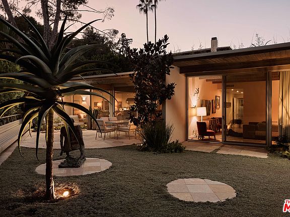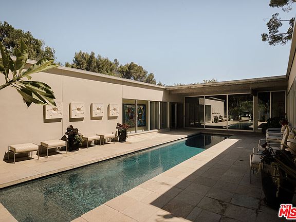 Step into this reimagined Post & Beam mid-century retreat, impeccably maintained with uncompromising attention to detail. Nestled in a serene Brentwood canyon setting, this 4-bedroom, 4.5-bathroom residence embodies timeless architecture. The signature atrium floor plan, framed by walls of glass and centered around a lap pool, seamlessly connects indoor and outdoor living while filling the home with natural light. At the heart of the residence, a new chef's kitchen with Viking and Sub-Zero appliances, a center island with a separate sink and custom finishes. This creates the perfect gathering space for both intimate dinners and large-scale entertaining. Framed by a striking double-sided fireplace, the living room offers two distinct sitting areas, each with sliding glass doors that open to the pool and backyard for seamless indoor-outdoor living, while a signature mid-century bookcase adds architectural character to the space. Each bedroom is ensuite and two of the three guest rooms have direct access to a large side yard, ideal for a sauna + cold plunge. The primary suite is a serene retreat with spa-like amenities, including a jetted tub, a walk-in closet with custom cabinetry, and a sliding glass door that opens directly to the backyard. Outside the primary bathroom, there's a custom dog run, which creates a private outdoor space for your furry friends. Beyond the interiors, there are multiple outdoor spaces including a front yard that could be used as a potential playground for kids. Situated just a short stroll from Kenter Elementary, yet far enough to avoid school traffic.
