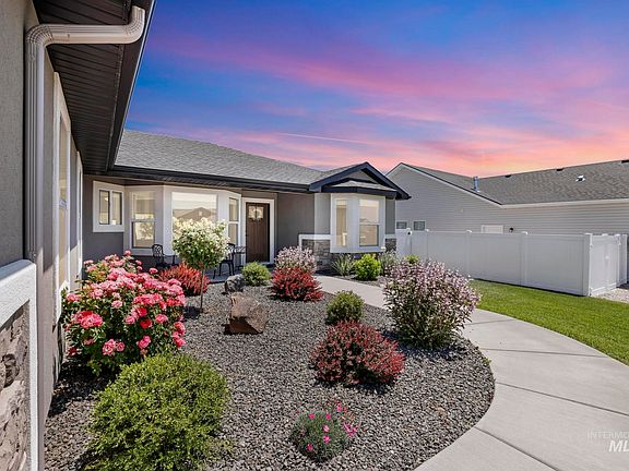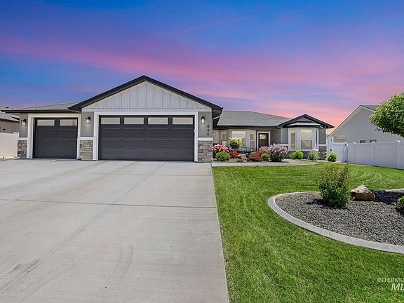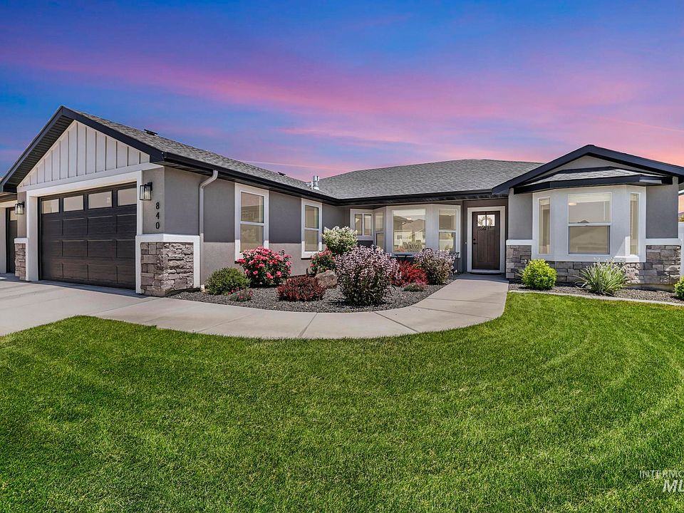 Welcome to 840 Skyridge Way in Kimberly, ID—a meticulously maintained, custom-built home just three years young & packed with thoughtful upgrades. Right from the start, you’ll be drawn in by the abundance of natural light pouring through the windows. The kitchen is a true standout, featuring a custom vent hood, a gas oven, full tile backsplash, breakfast bar, & a window over the sink. The dining area is highlighted by a charming bay window, while the living room centers around a striking stone fireplace, ideal for cozy gatherings. This split-bedroom layout offers privacy & functionality, with 2 guest bedrooms & a full bath on one side, & a spacious primary suite on the other. The primary retreat is flooded with natural light & includes a glass shower, walk-in closet, & serene backyard views. Step outside to an immaculate backyard complete with a large covered patio, beautifully manicured landscaping, shed, & RV parking space. The 3-car garage is fully finished, with a wash sink, & is wired for an electric car