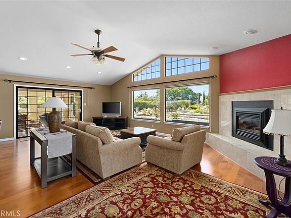 The formal living room exudes warmth with a gas fireplace, recessed lighting, and dual sliding doors that open to a serene backyard retreat. A covered patio provides the perfect space for enjoying your morning coffee while taking in the meticulously maintained grounds, complete with meandering concrete paths, raised garden beds, decorative gazebo, fountain, and cozy firepit.