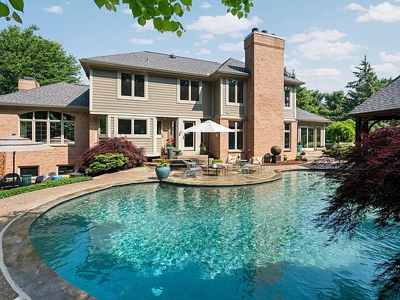 Flawless in design, magnificent in scale, and perfectly positioned on two breathtaking acres, this stunning estate is a masterclass in elegance, comfort, and modern sophistication. The grounds are a work of art, with professionally designed landscaping that frames the home and leads to the crown jewel: a secluded, resort style backyard featuring an inground heated pool, hot tub, waterfall, and gazebo, all surrounded by multiple patios ideal for relaxing, entertaining, or simply soaking in the tranquil views. The brick exterior paired with Hardie Board siding ensures a beautiful, low maintenance exterior so you can spend more time enjoying your surroundings and less time worrying. Inside, the layout is both luxurious and livable. The grand living room, filled with natural light, boasts a fireplace, custom built-ins, and Santos Mahogany flooring, flowing seamlessly into the spacious dining room.