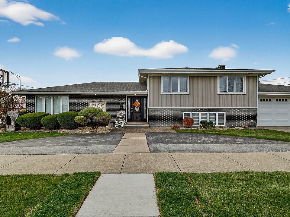 Oversized split-level situated on a desirable corner lot, offering strong curb appeal and exceptional interior and exterior space. This well-maintained home provides over 2,250 sq ft of finished living area plus an attached garage with rear access. The main level features a bright open-concept living and dining area with updated flooring, white trim, LED recessed lighting, and large windows that bring in excellent natural light. The eat-in kitchen includes abundant refinished cabinetry, solid counter space, built-in oven and gas cooktop, built in desk and a separate table area with sliding doors to the backyard. The upper level offers 3 spacious bedrooms with generous closets, including a dual-closet primary bedroom, newer flooring along with an updated full bath featuring both a walk-in stand-up shower and a separate shower/tub combination. The lower level-full of natural light provides a substantial family/rec room with newer wood laminate flooring, LED lighting, and a natural stone wood-burning fireplace, creating a versatile space for entertaining, fitness, or flexible living. The lower-level laundry/mudroom includes additional cabinetry, utility sink, and a second full cooking range ideal for gatherings or secondary kitchen use. Updated basement bath with a custom-tiled walk-in shower featuring a herringbone accent, built-in niche, and modern fixtures. Includes a contemporary vanity with marble-look top, framed mirror, gray neutral walls, and a privacy window for natural light. Major improvements include roof and window replacement in 2015; siding and soffits replaced in 2015; furnace updated with new components and a new water heater approximately two years ago; newer laminate flooring in bedrooms, living/dining/family rooms, hallways, stairs. AC unit is estimated at 15 years, well maintained and currently functioning perfectly. Exterior features include a fully fenced yard, wide concrete side drive plus large circular front driveway, attached garage with back-yard access, a custom brick wood-burning outdoor fireplace, a permanent granite-top masonry outdoor table, and a finished outdoor shed/workshop that stays with the property. Located close to parks, schools, shopping, dining, and major expressways. A well-cared-for corner home offering outstanding indoor and outdoor living options. Act now!