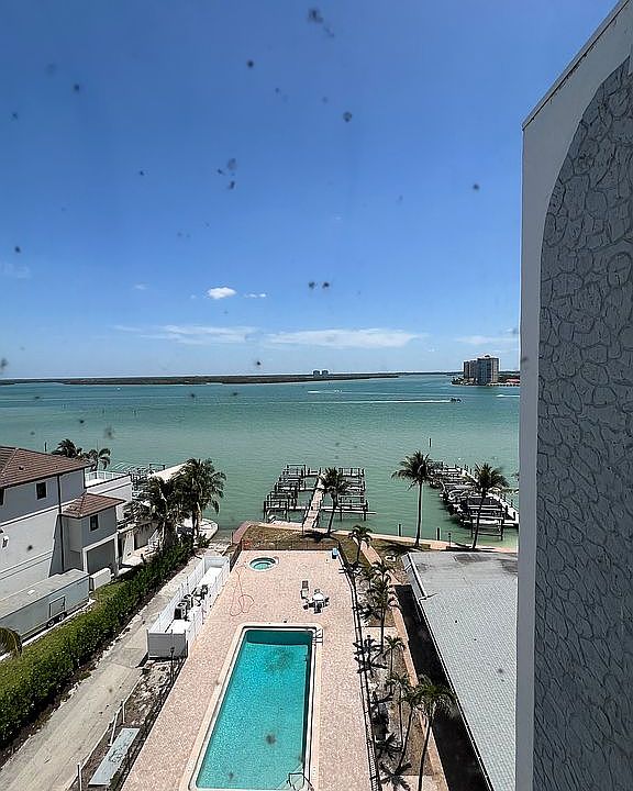 Condominium located at the quiet south end of Fort Myers Beach bay side with water access having 24 boat slips seconds from the Gulf of America!! Floor 7 out of 8 corner unit with a view of 180 degrees of water and nature. Dolphins, manatee, birds and other wildlife is a daily occurrence. Updated kitchen, master bath and walk in closet. Breakfast nook with views of pool and bay. Beach is right across the street 5 minute walk from condo. Under building garage spaces are included and are seniority assigned but many outside parking spots are assigned. Post hurricane damage recovery resulting in new windows and doors to be installed along with a rebuilt clubhouse and one dock area. New roof with new air conditioners and air handlers along with new hot water tank. Newly installed flooring throughout all of the condo along with fresh paint in all rooms.