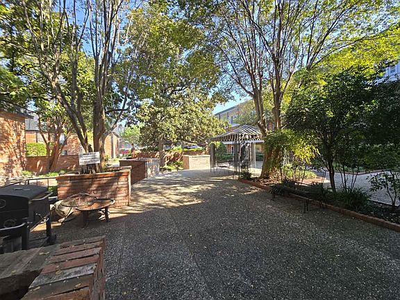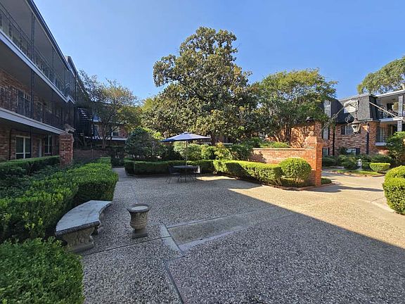 Mature oak treesLush courtyardShaded seating areasSleek stainless steel countersFully updated kitchen