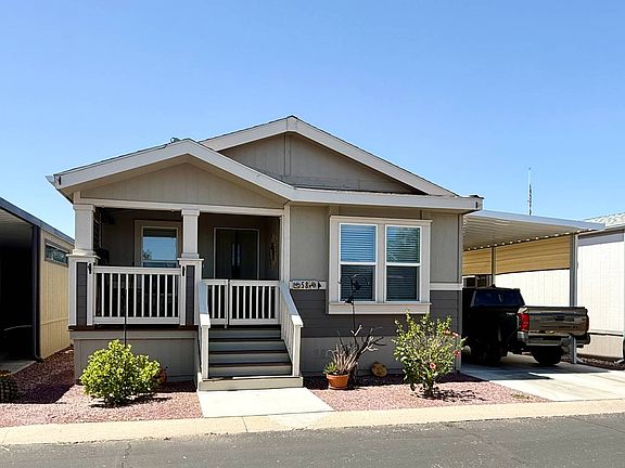 Welcome Home! Experience easy living in this bright and open 2019 Cavco home featuring 1,392 sq. ft. of modern design. The layout includes two bedrooms, two bathrooms, and a stylish den or office framed with French doors, offering both flexibility and comfort. Step inside and you'll immediately notice the spacious, open layout with extra-wide hallways and doorways for easy access, while maintaining that flowing, open feel. The gourmet kitchen is a true showstopper, complete with high-end stainless steel appliances, a large island perfect for entertaining, pristine white cabinetry, and a stylish tile backsplash. The primary bedroom offers a peaceful retreat with a private en suite bathroom, double sinks, a walk-in shower, and a large linen storage closet. Enjoy mountain views from your covered front porch, or unwind in your fenced patio-perfect for a small dog. Additional highlights include: Drip irrigation system, Water softener & reverse osmosis system, Solar screens for energy efficiency in the primary bedroom, 8x10 Tuff Shed for extra storage,Front Porch - Composite Material and Screen, Carport Screen, Skylights in both bathrooms, New Washer and Dryer in 2025. Located in a vibrant 55+ resort-style community, this home combines quality, comfort, and value. Motivated seller-this stunning home is priced to sell and ready for you to move right in! Schedule your private showing today before it's gone! Lot rent is subject to change based on current park rates.