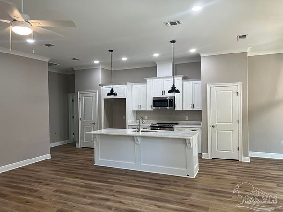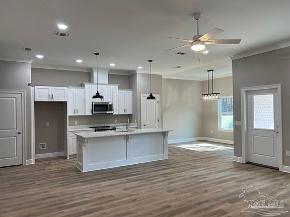 Tucked amongst a natural buffer of trees your New Craftsman Built home awaits .Nestled at the end of 3 other new builds~This luxurious 3 bed/2 bath floor plan with a 2 Car garage will be ready for an late fall move in ~Great Central Location with easy access to~Navarre Beach,Navarre Waterfront Park and Hwy 98 to Hurlburt Field AFB.This Stunning Robbins Builders Custom Home offers trend setting Features~Greeted by a walk in foyer sweeping through to your open floor plan~Large kitchen enjoying Shaker cabinets with crown molding, beautiful quartz counter tops~Under mount sink~S/S appliances ~Two pantries ~ Center Island with sleek top breakfast bar & open flow to the dining area, large family room & separate office/flex room all enhanced with gorgeous vinyl plank flooring.... Master bedroom with trey ceiling & ceiling fan~ Master bathroom boasts plenty of dressing area with his and her closets ~ oversized TILED walk in shower with seamless glass door~quartz vanities with rectangular under mount sinks ~picture frame mirrors and separated by a large linen closet all beautifully complimented by brushed nickel fittings. Additional bedrooms are a great size, double closets and ceiling fans~Additional bathroom has a large vanity with a tub/shower and adjacent linen closet. Home has a welcoming covered front porch and large covered back porch to sit out and enjoy those wonderful Florida evening ~great to cook out and entertain with a South facing back yard surrounded by trees.Irrigation well and timed sprinkler system for easy care~ Hurricane protection for windows and dimensional shingle roof for lower insurance premium. Upgrades throughout include crown molding, recessed lighting , deluxe lighting package,50 Gallon water heater, garage door remotes, attic drop down stairs~ to name a few....