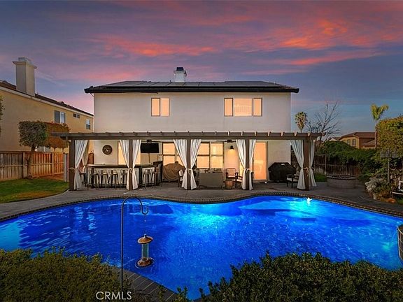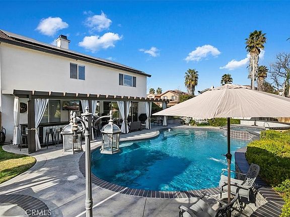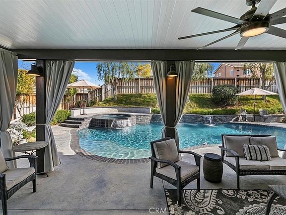 The Backyard has a Pool and Jacuzzi with Multiple Waterfalls and the plush Landscaping feels like a Private Retreat with a Custom Alumawood Patio Cover spanning the entire back of the house, Fully loaded with Lights, TV, Ceiling Fans and a Sprawling BBQ Island with a seat for Everyone! Along with 2 Separate Fire pits, Lighting throughout the Backyard and surrounding the Pool extending the invitation through the night! You wont miss the Grassy Yards on both sides of the house that offer a storage shed for the pool toys and Dog run for the pups.