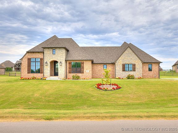 Welcome home to your single-story dream in The Meadows! Located just minutes from Hwy 75, Hwy 169, and everything Owasso has to offer, this home has it all-style, space, comfort, and convenience-at an incredible price! This gorgeous, 3-year-old home has been meticulously maintained and beautifully styled. Featuring 4 bedrooms plus an office and an additional flex room, there's space for everyone. The primary suite is a true retreat with a massive tiled shower, private water closet, spacious walk-in closet, and plenty of natural light. Step outside to the expansive A-frame covered patio overlooking a sprinkler-kept .77± acre yard, perfect for relaxing or entertaining. Inside, you'll love the premium finishes: wood floors, natural stone countertops, custom tile, cabinetry, and detailed woodwork. The light and bright kitchen offers a large pantry and soaring ceilings, and the neutral color palette makes it move-in ready. This home is energy certified and fully fenced, with a washer, dryer, refrigerator, and even a saferoom/storm shelter included!