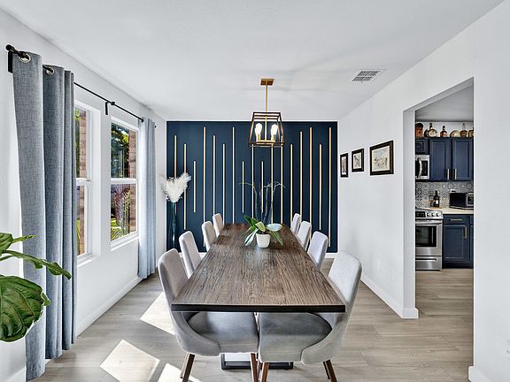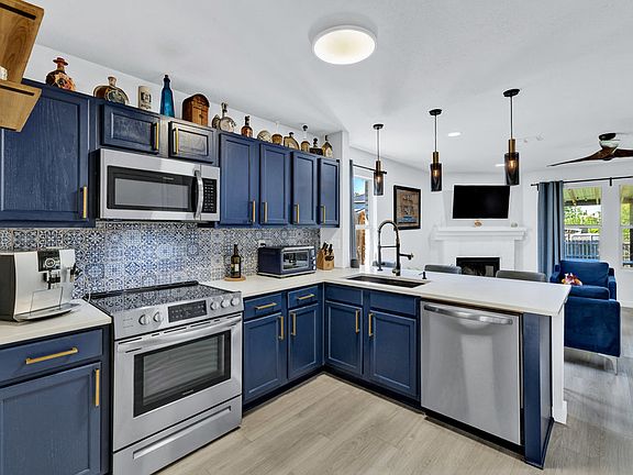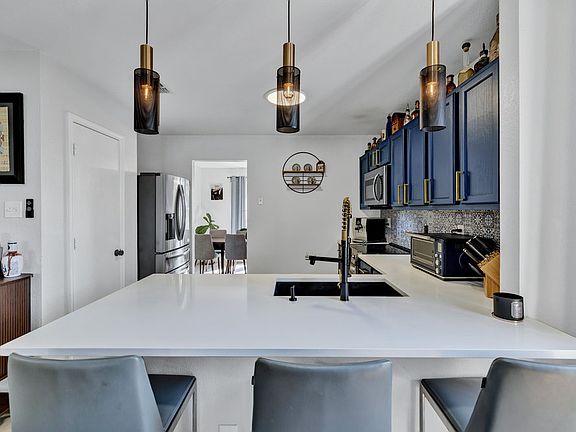 Stylish backsplashUnique design touchesBeautiful covered patioCommunity poolLovely parkModern blue cabinets