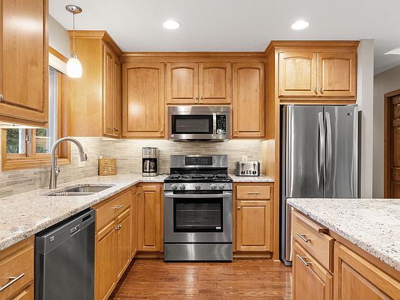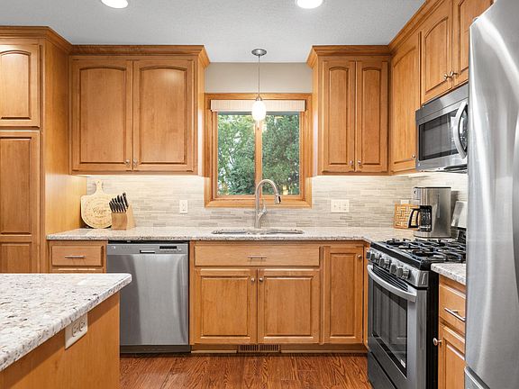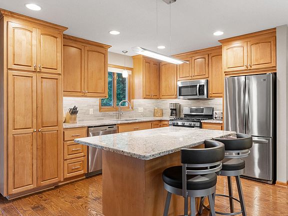 Beautifully updated home on quiet cul-de-sac in the heart of Maple Grove! Location, location, location! This meticulously maintained, turnkey home, owned and cared for by the original owners, offers 3 bedrooms, 2 bathrooms, and a 2-car garage on a peaceful cul-de-sac in one of Maple Grove’s most accessible neighborhoods. Step inside to a bright, open-concept upper level featuring a stunning kitchen remodel with custom maple cabinetry, soft close doors and drawers, hand-scraped oak wood flooring, a large center island, granite countertops, tile backsplash, and stainless steel appliances. The kitchen flows seamlessly into the dining area and out to the three-season porch, maintenance-free deck, and paver patio with fire pit—perfect for relaxing or entertaining. The upper level also includes a welcoming living room, all three bedrooms, including the primary with walk-in closet, and a beautifully updated full bath. Downstairs, enjoy a cozy family room with gas fireplace, laundry area, and an updated 3/4 bath with a walk-in shower. Additional highlights include - a large 0.37-acre lot with partial privacy fence, Andersen windows on the front of the home and French doors to the porch, vaulted ceiling and new LVP flooring in the three-season porch, cement board siding on the sides of the home, seal-coated driveway (2025) and new water heater (2024). Enjoy unbeatable access to everything Maple Grove has to offer — just minutes from Arbor Lakes, Main Street, Central Park, Maple Grove Community Center, and Life Time Fitness. With top-rated schools, shopping, dining, and recreation all nearby, this home delivers the perfect blend of comfort, space, and convenience.