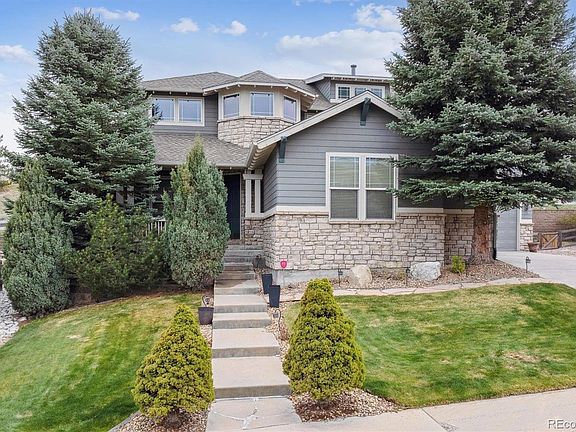 Superior Luxury Home in Highly Desired Castle Pines North! Move-In Ready & Thoughtfully Updated! Excellent flowing floorplan w/5 Beds (or 4 Bed & Main Fl Office), 4 Baths, Loft, Finished Basement w/Theater Room, Upper Laundry Room & *RARE* 4-Car Garage. Over 5560 Total Sqft! Ultra Private 0.21-Acre Lot in Cul-De-Sac w/Deck, Lower Patio, Waterfall Feature, Mature Trees/Landscaping w/Flat Grass Area & No Neighbors Behind! Lavish Home offers high-end features including stylish wide-plank LVP floors on most of main level & whole house vacuum. Enter to find an impressive vaulted entryway between Living Room w/vaulted ceiling & many windows, sizeable Dining Room w/Butler’s Pantry leading to Kitchen. Opulent, Updated Gourmet Kitchen boasts ample 42” white cabinets, quartz counters/subway tile backsplash plus huge island & pantry. Upgraded stainless steel appliances including gas cooktop & hood, lower wall oven/upper microwave, fridge. Spacious breakfast nook w/more cabinets & back yard access. Opens to generously sized Family Room featuring gas fireplace w/upgraded tile surround & built-ins. Updated 3/4 bath sits next to main floor bedroom/office. Escape to the impressive Primary Retreat via private staircase w/sitting area & gas fireplace; leads to spacious bedroom featuring tray ceiling & built-ins. Spa-like 5-pc bath w/corner soaking tub, dual vanities & huge walk-in closet. Second entry door leads to loft w/built-in desk & sizeable laundry room w/upper & lower cabinets. Bed #2 has private 3/4 bath; Beds #3 & #4 share Jack & Jill bath w/private sinks. Finished Basement features awesome Theater Room including screen, projector, sound components & couches. Large Rec/Bonus Room for many uses; multiple storage rooms. Rare (2) two car garages! Great curb appeal & covered front porch. Newer 80-gal water heater, dual HVAC units, newer roof, hot tub ready patio, garage workbench/shelves. Feeds to top-rated schools, easy to I25! Low HOA, 14-mo Buyer’s Warranty. Truly Must See!