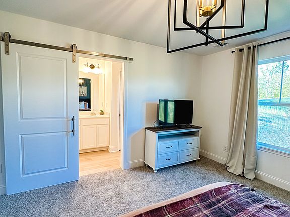 Generously sized pantryModern metal handrailCustom wall detailBarn sliderLvp flooringStainless appliance packageGranite countertops