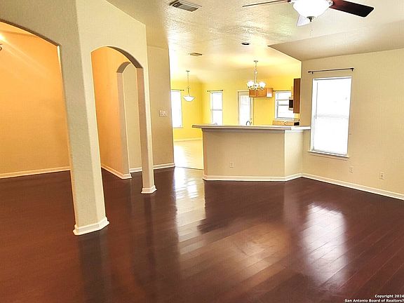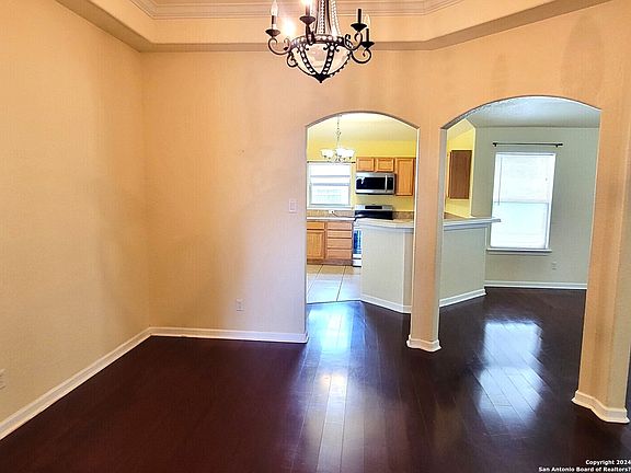 Custom 3 bedroom 2 bath 2 car garage home in desirable NW Wildwood. Open arches, rounded corners, arched niches, and vaulted ceilings are just a few of the architectural features. Open floor plan, formal dining can be used as an office. Eat in the Kitchen and breakfast bar. Beautiful laminate wood floors in all living areas. Carpet in bedrooms. Nice big covered patio for fun summer barbeques. Huge backyard with double side gate for trailer storage. Northside ISD. Conveniently located close to 1604 shopping,