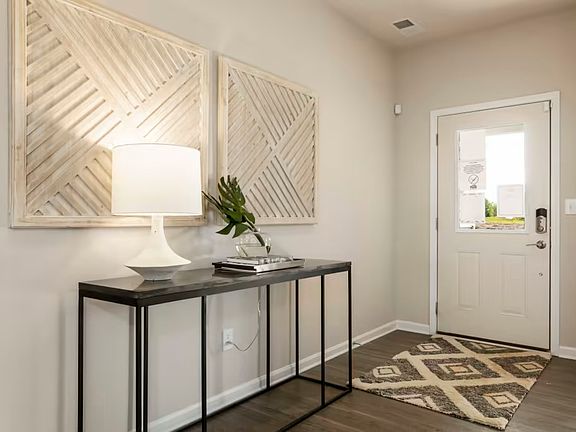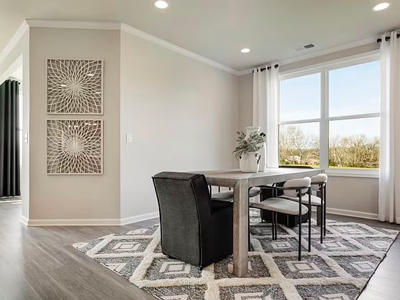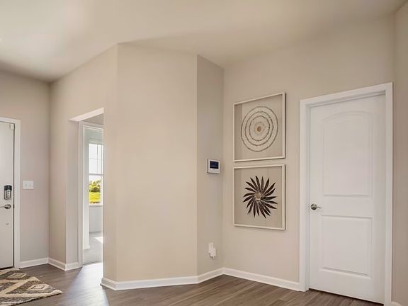 Available in March, this ranch style Ascend floorplan boasts a large, rounded island, open living spaces, and a covered patio, which is perfect for entertaining! This home offers a gourmet kitchen that features quartz countertops and stainless-steel gas appliances with an exterior hood vent and upgraded cabinetry. This three-bedroom home sits on a beautiful pond homesite and has impressive finishes, including wainscot trimming in the spacious foyer and brushed nickel hardware throughout.