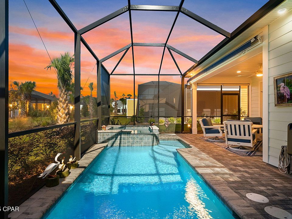 Step outside to your private retreat on the extended screened lanai, showcasing a sparkling private pool and hot tub, paver surround, privacy screens, and a Sunsetter electronic shade for added comfort.