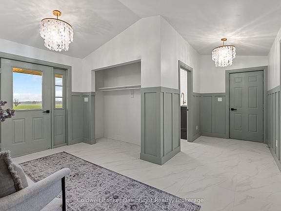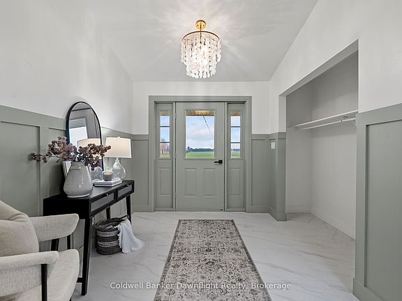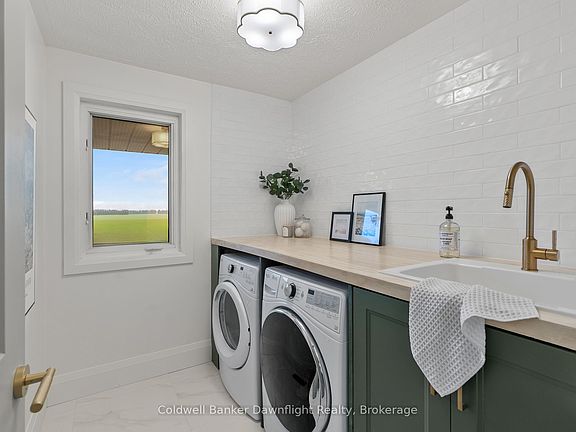 Out where the nights go quiet and the sky still turns gold at dinner hour, this double yellow brick country home sits on 1.88 acres, calm, finished, and ready for its next people. No renos. No projects. Just move in and start living. Inside, the home feels fresh and grounded. White walls, soft greens, and warm black and gold accents play off natural wood tones for that modern farmhouse feel. The kitchen is the kind that makes you want to cook again, with a massive quartz island, pot filler, and a door to the deck where you catch the sunset over the fields. Off the entry, the laundry room is both beautiful and practical, and the main floor bedroom doubles perfectly as an office. The living room opens to the kitchen so no one ever misses the game or the conversation. The bay window floods the space with golden evening light, while a tiled electric fireplace and reclaimed wood-beam mantle add cozy charm. Upstairs, the primary bedroom feels like a quiet retreat, airy, calm, and spacious enough for a king bed and sitting area. The upper bath is the true showstopper: a full wet room with an open-concept shower and freestanding soaking tub, tiled to the ceiling and accented with gold fixtures. Both bathroom vanities feature warm wood textures, including a stunning fluted double vanity that feels straight out of a design magazine. Outside, the lifestyle speaks for itself, natural gas heat in the country, fibre internet, mature trees, and open, flat land with room for a future shop, garden, or pool. The deck is updated, water and hydro are already run outside, and the double garage with inside entry is spotless. If you've been waiting to move to the country without inheriting someone else's projects, this is the one you simply walk into and start living.