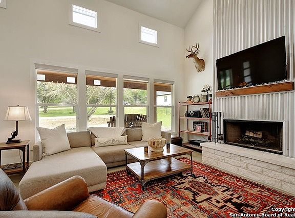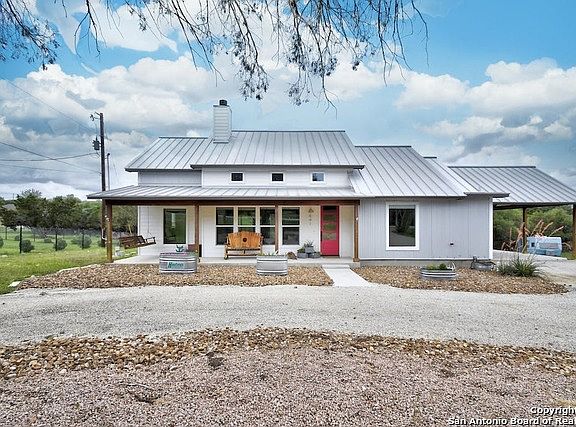 Super cool industrial farmhouse set on beautiful one acre lot in highly sought after Spring Branch. Large circle drive introduces you to this fun and functional home. Every bit of space is used to enhance its livability. The up-to-date architecture and finishes in the home are like nothing else in the area. A few of the features include: 2 lofts, polished concrete floors, barn doors, commercial grade ladder, corrugated metal siding and fireplace, standing seem metal roof, oversized carport with cedar ceiling, two covered porches with cedar ceilings and custom cabinetry throughout home. Play games, watch a movie or just relax in the elevated loft above the primary bedroom. Motorized lift conveys with house. Enjoy the view of the rock lined wet weather creek or walk to the neighborhood six-acre park and with pool. Community also includes private access to Guadalupe River with quarter mile of river footage. Fish, swim, or put in your kayak and enjoy one of the region's most beautiful rivers. Many items convey including free standing storage building, refrigerator, washer/dryer and front porch swing. Agent is owner.