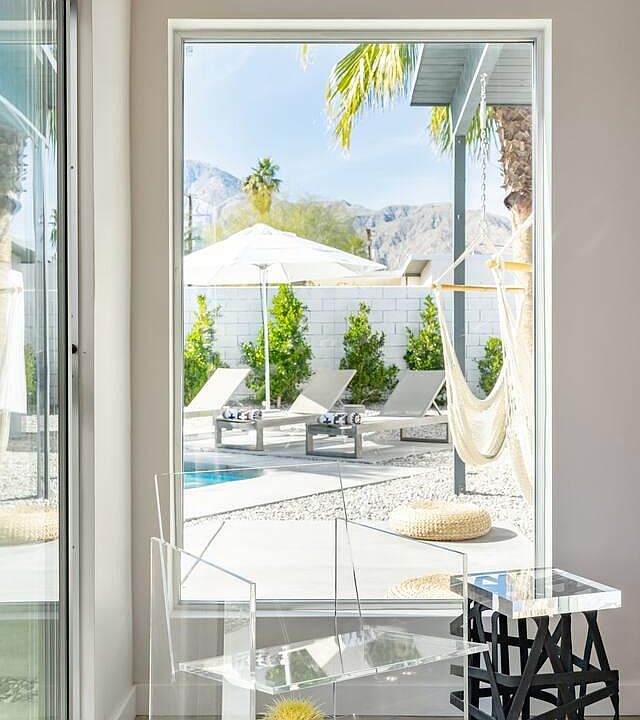 Owned by designers, this genuine Alexander home built in 1959, has since been lovingly restored, added to, and updated while keeping much of its original architecture. Each of the rooms is furnished with the owners custom 'Desert Collection.' Enjoy drinks and conversation while swinging in hammocks by the side of a tranquil salt pool. Watch the sunset over the mountains, making memories that last a lifetime. The house is in the historic Racquet Club Estates of Palm Springs. It's a 5-minute walk to a park and tennis courts. Drive in minutes to a grocery store, the Uptown Design District, and downtown shops, movies, restaurants, and a water-slide park. Tenant pays for all utilities. Renters must be 25 years or older No events, parties, or photoshoots No smoking indoor/outdoors NO AMPLIFIED MUSIC is permitted outdoors at ANY time. As a reminder, excessive noise (Palm Springs Municipal Code 5.25.070 (f)) and amplified music (Palm Springs Municipal Code 5.25.070(g)) is not allowed outside of the Vacation Rental unit. Music heard at the property line (including music coming from inside of the home) is a violation of the Vacation Rental Ordinance. Guests in violation of the code will be issued a fine in the amount of $500.00. Additionally, this violation will count as a strike toward the Registration Certificate and you will forfeit your deposit on the rental.